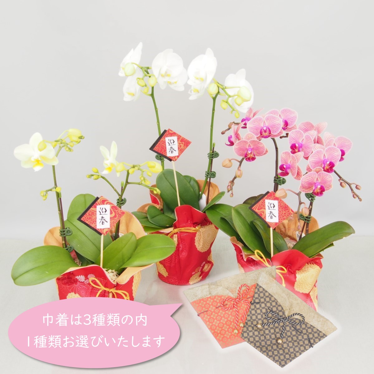 巾着仕立てのミニ胡蝶蘭寄せ植えです。